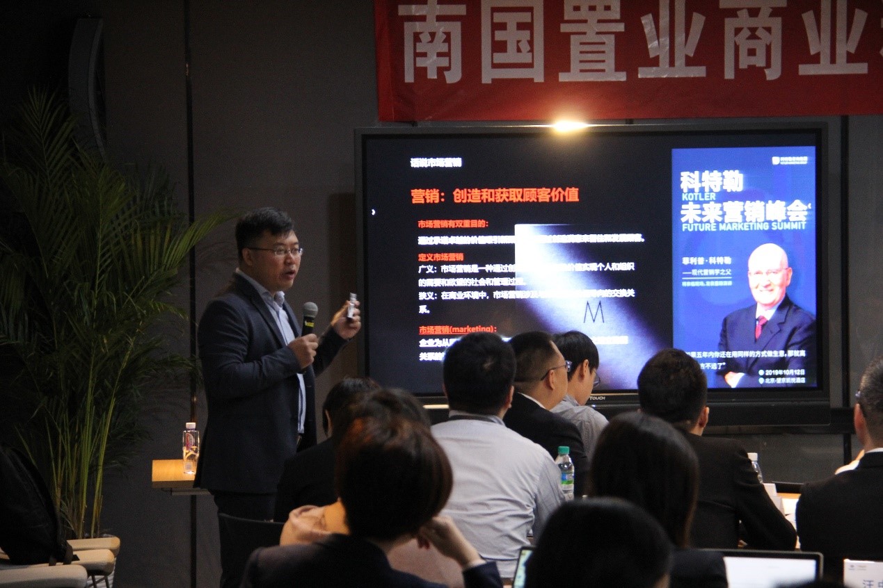 在首日的培训中,敖战鸣老师从公司企业愿景和商业各大产品线的实际情况开始分析公司营销的基本情况,根据公司年报分析2018年与2019年公司商业物业出租及物业管理相关数据,进而开始讲解关于市场营销的知识。紧接着从顾客的需求出发,提出市场部最重要的工作应该是为顾客和企业创造无形价值,从“人”、“货”、“场”的塑造讲授如何创造这种无形的价值。